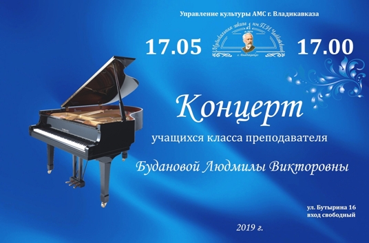 | Концерт учащихся класса преп. Будановой Л. В. - 17 мая 2019 г.17 мая состоялся концерт учащихся класса преподавателя Будановой Людмилы Викторовны.